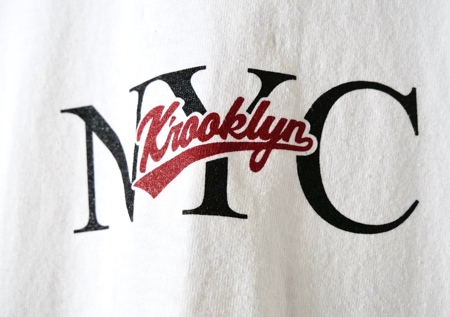 NYC LOGO T-SHIRT ニューヨークのアイコン的な文字ロゴをK’rooklynテイストにフィーチャーしたTシャツ。 サイズ---着丈/身幅/袖丈/肩幅 S---69/46/19/44.5 M---73/50.5/21/50 L---79/55/22.5/54 XL--83/60/23/61.5 XXL--84/65/24/62