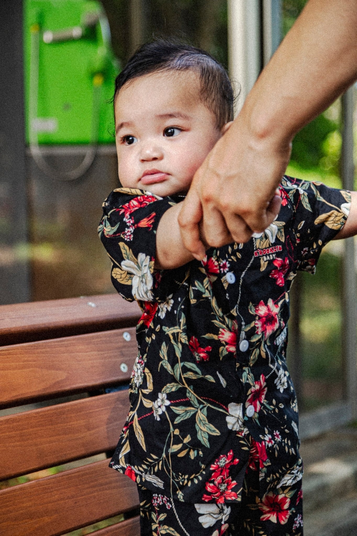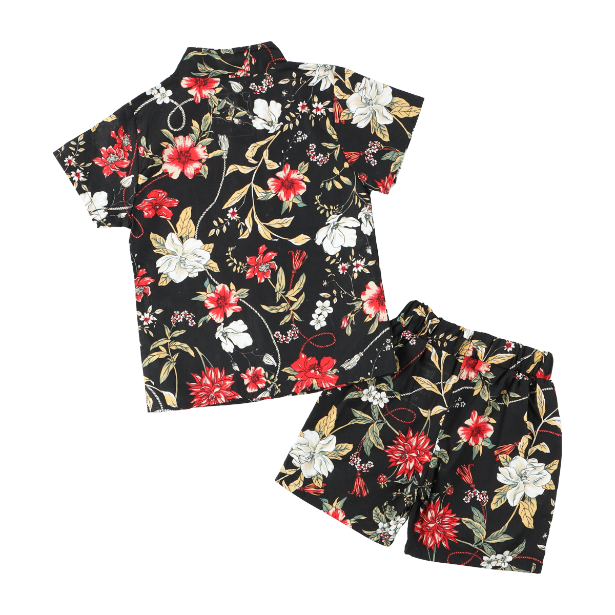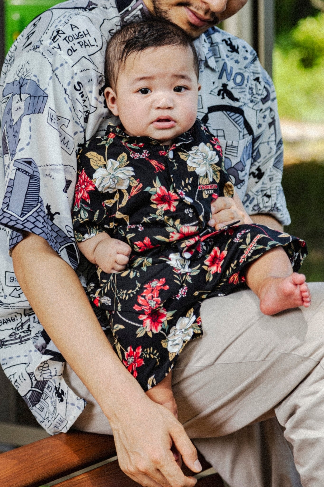 K'rooklyn Baby Aloha Shirt & Pants 黒をベースとしたシックなアロハ柄が全面にあしらわれたベビーサイズのシャツとハーフパンツ。セットアップでも単体でも着られる着回しのきくアイテムです。